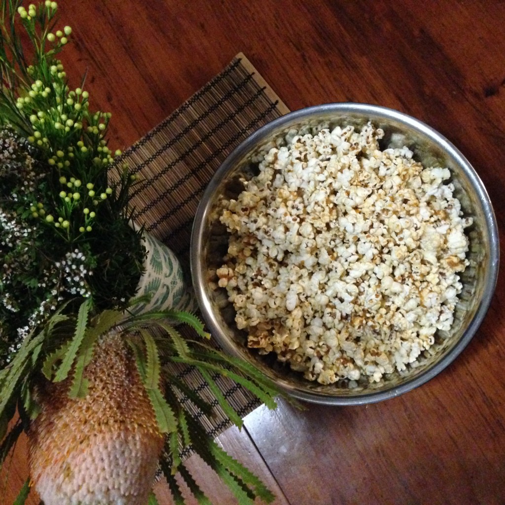 Now place the pan back on the heat and add the butter. Let it start to melt then add the spices and salt. As soon as the butter starts to brown, take it off the heat and pour over the popcorn as evenly as you can. Sprinkle the nutritional yeast over the popcorn, then stir it all through so that it is evenly coated. You might like more or less salt to taste, or more or less butter.