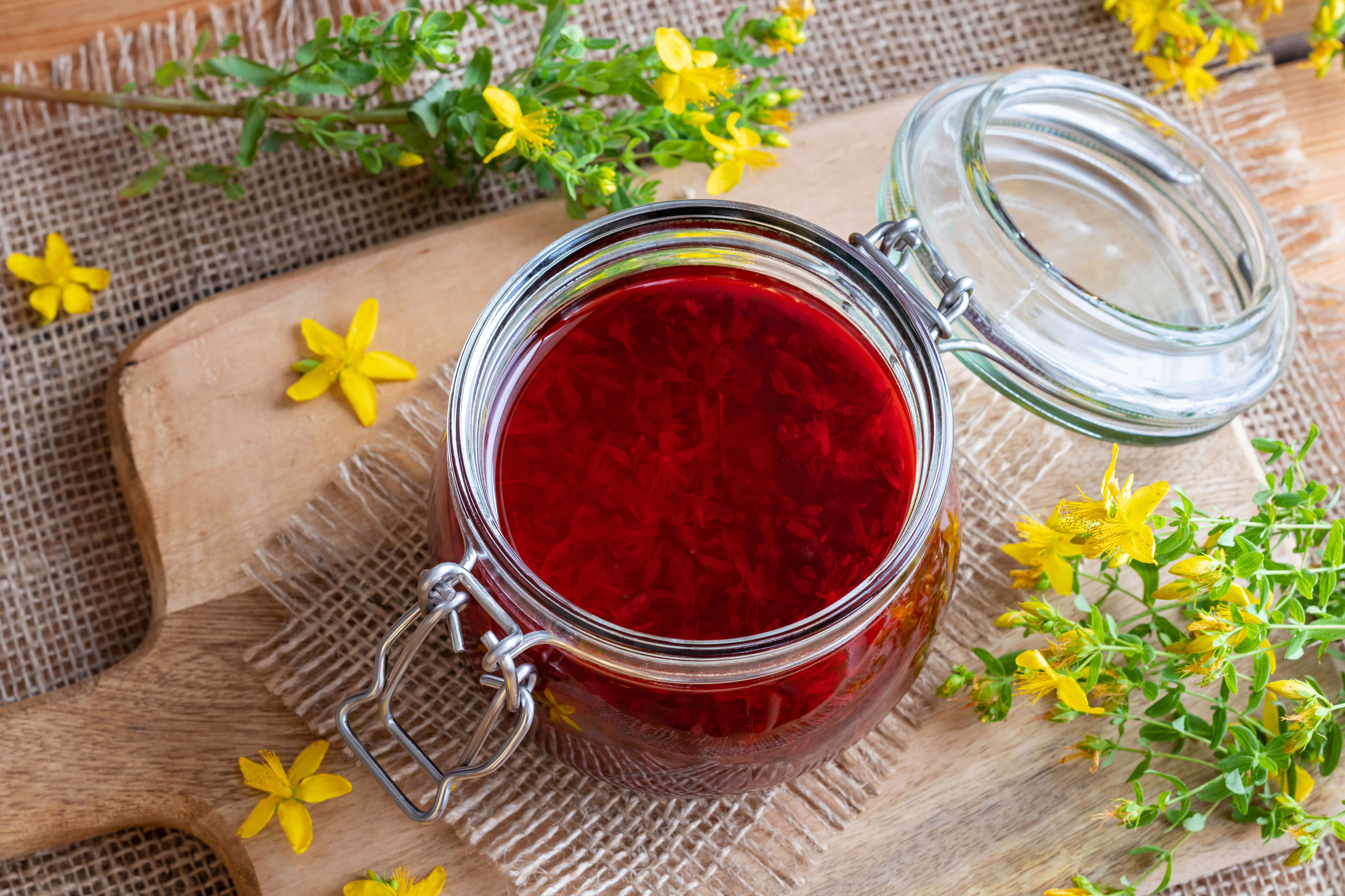 St. John’s wort flowers macerating in oil, to prepare St. John’s wort oil