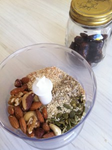 In a food processor blend the nuts and seeds until the become a coarse powder. Finely chop the dates or blend as well (if they’re too dried you’ll have trouble blending them).